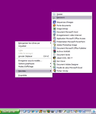 Placez vous où vous voulez, sur le bureau par exemple, et cliquez avec le bouton droit de votre souris sur une zone vide de l'écran. Pour cela allez sur "Nouveau", puis cliquez sur "Raccourci".